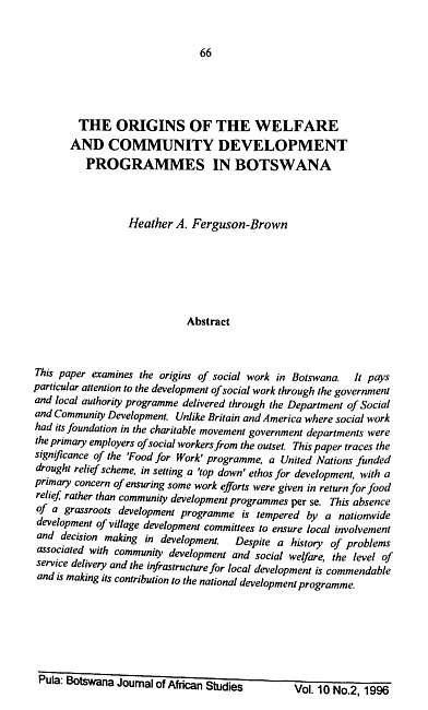 This paper examines the origins of social work in Botswana. It pays particular attention to the development of social work through the government and local authority programme delivered through the Department of Social and Community Development. Unlike Britain and America where social work had its foundation in the charitable movement government departments were the primary employers of social workers from the outset. This paper traces the significance of the "Food for Work" programme, a United Nations funded drought relief scheme, in setting a "top down" ethos for development, with a primary concern of ensuring some work efforts were given in return for food relief, rather than community development programmes per se. This absence of a grassroots development programme is tempered by a nationwide development of village development committees to ensure local involvement and decision making in development. Despite a history of problems associated with community development and social welfare, the level of service delivery and the infrastructure for local development is commendable and is making its contribution to the national development programme.