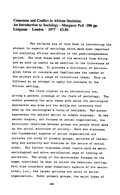 Review of: Margaret Peil. Consensus and conflict in African societies. London: Longman, 1977