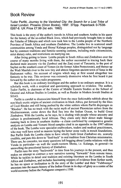 Review of: Tudor Parfitt. Journey to the vanished city. London: Phoenix, 1997