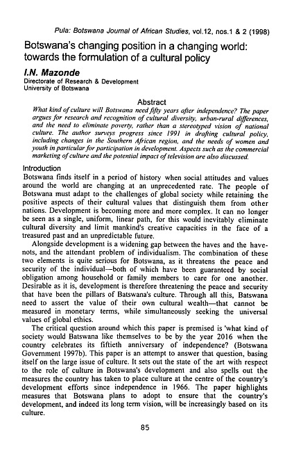 Botswana's changing position in a changing world : towards the formulation of a cultural policy