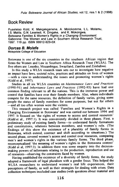 Review of: Puseletso E. Kidd et al. Botswana families & women's rights in a changing environment. Gaborone: Women and Law in Southern Africa Research Trust, 1997