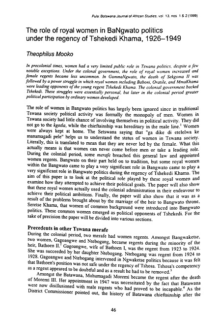 The role of royal women in BaNgwato politics under the regency of Tshekedi Khama, 1926-1949