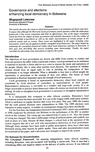 This article discusses the extent to which local government is an institution of choice and voice. It argues that although the Botswana Local government system operates within the multi-party framework, it has severe constraints that limit its effectiveness. One of the major constraints which has been the subject of many government and scholarly documents is the low caliber of local leadership (councillors) as well as the under representation of certain groups in the political system such as women. These issues are highlighted in the paper including some innovations, which may be applied to further strengthen local democracy. The paper begins by examining the conceptual framework within which local democracy operates in Botswana. It then goes into describing that process including some shortcomings. Finally, the paper concludes by advocating some innovations to improve the system.