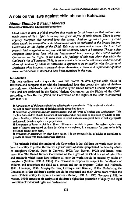Child abuse is now a global problem that needs to be addressed so that children are made aware of their rights in society and grow up free of such abuses. There is some urgency, therefore, that national laws that protect children against all forms of child abuse should be compatible with international laws as enshrined in the United Nations Convention on the Rights of the Child. This note outlines and critiques the laws that protect children against sexual, physical and emotional abuse in Botswana. The note also compares these local laws with the international laws, namely, the United Nations Convention on the Rights of the Child. The findings of this note show that while the Children's Act of Botswana (1981) is clear about what is and is not sexual and emotional abuse of children by adults in Botswana, it appears to be in conflict with the pieces of legislation when it comes to physical abuse. An outline, critique and implications of these laws on child abuse in Botswana have been examined in this note.