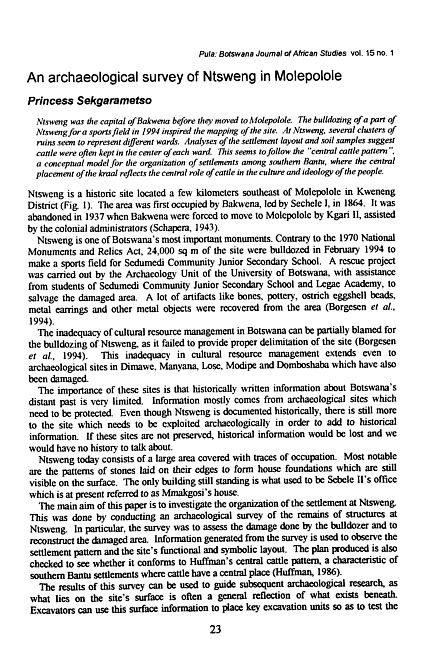 Ntsweng was the capital of Bakwena before they moved to Molepolole. The bulldozing of a pan of Ntsweng for a sports field in 1994 inspired the mapping of the site. At Ntsweng, several clusters of ruins seem to represent different wards. Analyses of the settlement layout and soil samples suggest cattle were often kept in the center of each ward. This seems to follow the "central cattle pattern", a conceptual model for the organization of settlements among southern Bantu, where the central placement of the kraal reflects the central role of cattle in the culture and ideology of the people.