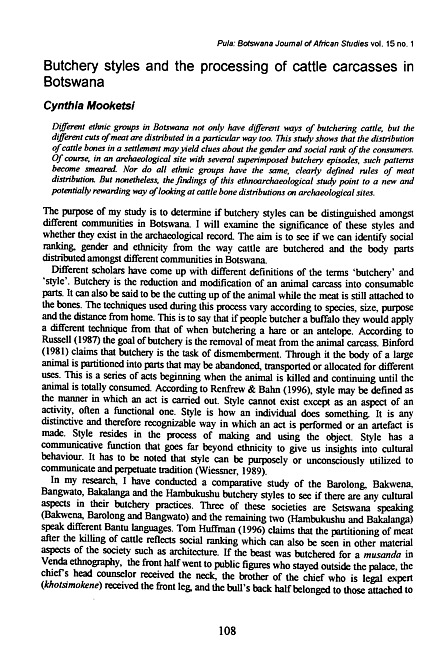 Different ethnic groups in Botswana not only have different ways of butchering cattle, but the different cuts of meat are distributed in a particular way too. This study shows that the distribution of cattle bones in a settlement may yield clues about the gender and social rank of the consumers. Of course, in an archaeological site with several superimposed butchery episodes, such patterns become smeared. Nor do all ethnic groups have the same, clearly defined rules of meat distribution. But nonetheless, the findings of this ethnoarchaeological study point to a new and potentially rewarding way of looking at cattle bone distributions on archaeological sites.