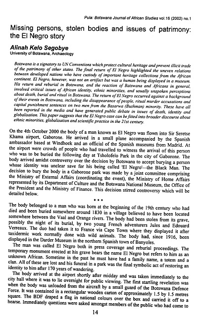 Botswana is a signatory to UN Conventions which protect cultural heritage and prevent illicit trade of the patrimony of other states. The final return of El Negro highlighted the uneven relations between developed nations who have custody of important heritage collections from the African continent. El Negro, however, was not an artifact but was a human being displayed in a museum. His return and reburial in Botswana, and the reaction of Batswana and Africans in general, involved critical issues of African identity, ethnic minorities, and usually unspoken perceptions about death, burial and ritual in Botswana. The return of El Negro occurred against a background of their events in Botswana, including the disappearance of people, ritual murder accusations and capital punishment sentences on two men from the Basarwa (Bushman) minority. These have all been reported in the media and have generated public debate in issues of death, identity and globalisation. This paper suggests that the El Negro case can befitted into broader discourse about ethnic minorities, globalisation and scientific practice in the 21st century.