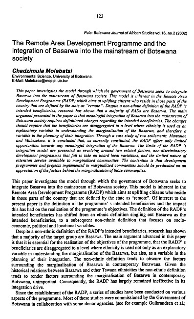 The remote area development programme and the integration of Basarwa into the mainstream of Botswana society