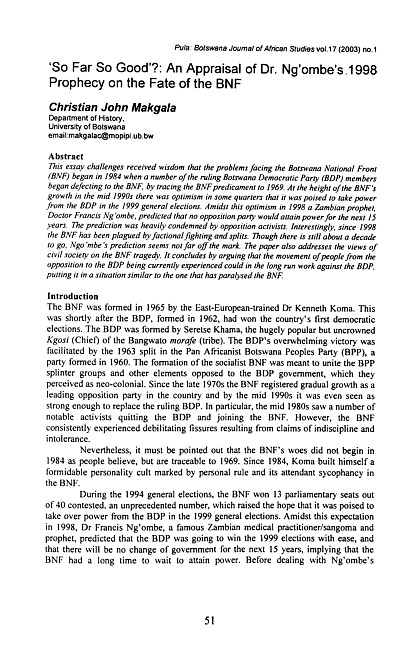"So far so good"? : an appraisal of Dr. Ng'ombe's 1998 prophecy of the fate of the BNF