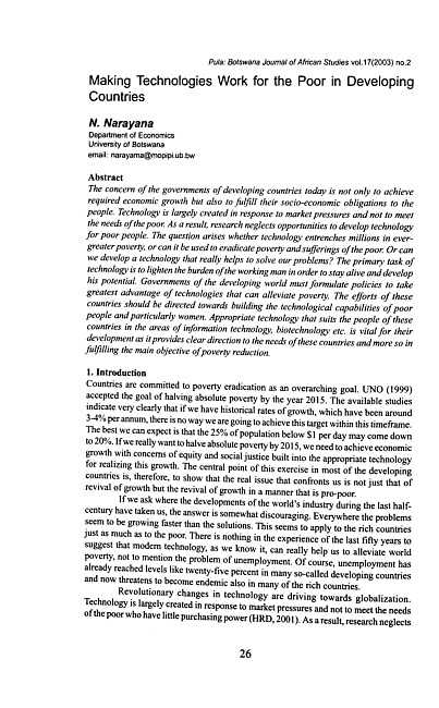 The concern of the governments of developing countries today is not only to achieve required economic growth but also to fulfill their socio-economic obligations to the people. Technology is largely created in response to market pressures and not to meet the needs of the poor. As a result, research neglects opportunities to develop technology for poor people. The question arises whether technology entrenches millions in ever-greater poverty, or can it be used to eradicate poverty and sufferings of the poor. Or can we develop a technology that really helps to solve our problems? The primary task of technology is to lighten the burden of the working man in order to stay alive and develop his potential. Governments of the developing world must formulate policies to take greatest advantage of technologies that can alleviate poverty. The efforts of these countries should be directed towards building the technological capabilities of poor people and particularly women. Appropriate technology that suits the people of these countries in the areas of information technology, biotechnology etc. is vital for their development as it provides clear direction to the needs of these countries and more so in fulfilling the main objective of poverty reduction.