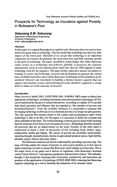 In this paper it is argued that judged on a global scale, Botswana does not seem to have achieved a great deal in technology. This has meant that technology has had very little impact on the rural poor. Therefore if we accept that technology is an important component of economic development, the rural areas have had little economic growth in the form of technology. The paper nonetheless acknowledges that whilst Botswana comes across as a technology non-achiever globally, it possesses the requisite infrastructure (such as telecommunications main lines that are 100% digital) to make technology work for her populace. The paper further advocates massive investment in training in science and technology, research and development to generate the critical mass of skilled researchers upon whom Botswana's technology-led development can be anchored. However any investment in building a human resource capacity that can support and maintain science and technological needs should be coupled to a strong desire to make use of the outcomes of research.