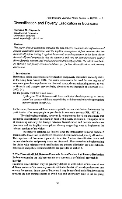 This paper aims at examining critically the link between economic diversification and poverty eradication processes and the implied assumptions. It first examines the link theoretically before testing it against Botswana's actual experience. It has been shown theoretically and empirically that the country is still very far from the vision's goal of diversifying the economy and eradicating absolute poverty by 2016. The article concludes by spelling out policy recommendations for further diversification and poverty alleviation.