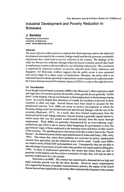 The major objective of this article is to indicate how Botswana may achieve the industrial development envisaged in the economic linkage model and thereby generate sustainable employment that would lead to poverty reduction in the country. The findings of the study are that poverty reduction through industrial-based economic growth that leads to employment creation is the most effective way of dealing with poverty. This conclusion is supported by empirical evidence on poverty reduction from China, Indonesia and Singapore. For Botswana, evidence suggests that the public sector is now saturated and can no longer be a major source of employment. Therefore, the policy shift to an industrial-based economic growth for employment creation and poverty reduction under the Citizen Entrepreneurial Development Agency (CEDA) is a step in the right direction.