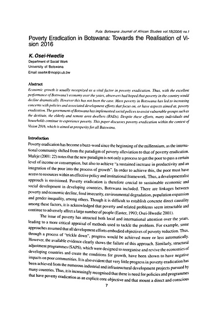Economic growth is usually recognized as a vital factor in poverty eradication. Thus, with the excellent performance of Botswana's economy over the years, observers had hoped that poverty in the country would decline dramatically. However this has not been the case. Mass poverty in Botswana has led to increasing concerns with policies and associated development efforts that focus on, or have aspects aimed at, poverty eradication. The govemment of Botswana has implemented social policies to assist vulnerable groups such as the destitute, the elderly and remote area dwellers (RADs). Despite these efforts, many individuals and households continue to experience poverty. This paper discusses poverty eradication within the context of Vision 2016, which is aimed at prosperity for all Batswana.