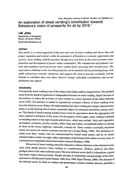This article is a critical appraisal of the pros and cons of street vending and shows that with proper regulation and control; within the parameters of freedom to economic opportunity and success, street vending could be a positive though not a core force in the socio-economic transformation and development of poorer urban communities. The romanticism and pedantic controls and regulation need not prevent street vendors from exercising their inventiveness. This represents a challenge to the view that prosperity can be attained only by promoting large-scale public and private economic enterprises and suggests the need to provide everybody with the latitude to contribute their own share, however meager individual contributions and accomplishments may appear.