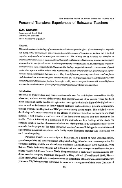 This article analyses the findings of a study conducted to investigate the effects of teacher transfers on family well-being. While much concern has been raised about the trauma of transfers on families, this is the first empirical study conducted to investigate these concerns. The primary aim of the study was therefore to understand the experiences of teachers affected by transfers. Data was collected using a survey questionnaire addressed to 361 transferred teachers in selected primary and secondary schools. In addition face-to-face indepth interviews were conducted with 20 couples. The findings suggest that transfers are a source of great strain when separate residences have to be maintained as a result of the transfer. In general couples experience enormous challenges in their marriages. They have difficulties parenting at a distance and are financially burdened due to maintaining two separate homes. The study provides much-needed literature on the impact of personnel transfers on families. It also offers policy makers and practitioners with a sound information base for the development of transfer policy that takes family needs into consideration.