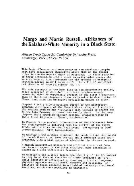 Review of: Margo and Martin Russell. Afrikaners of the Kalahari. Cambridge: Cambridge University Press, 1979