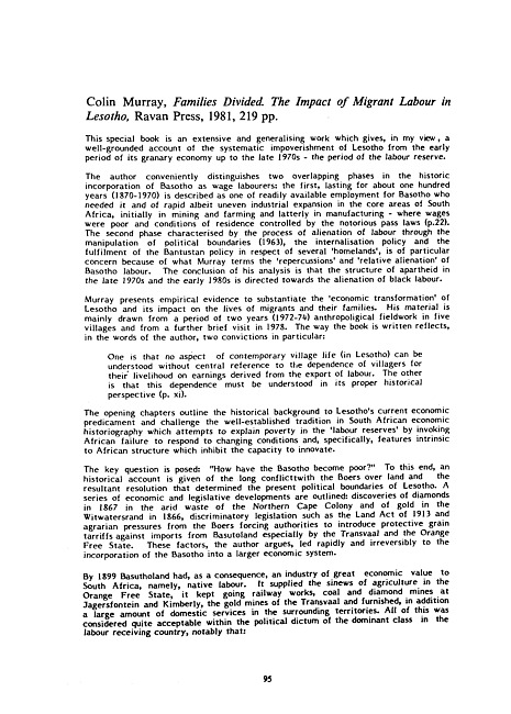 Review of: Colin Murray. Families divided. Johannesburg: Raven Press, 1981