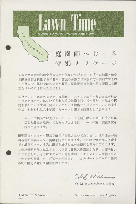 Includes: [Introduction by P. C. Williams]; [Spreaders]; Turf Builder; Dichondra Food; Dichondra Builder; Halts; Clout; Cope; Scutl; Bonus; 4-XD; Kansel; Picture; Family; Play; Dichondra; and Clovex.