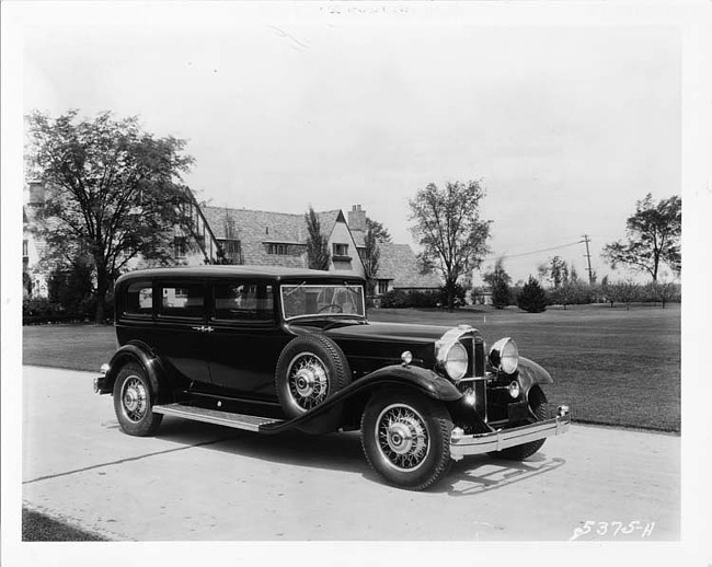 Still Image (1932)Part of Making of Modern Michigan1932 Packard sedan, left side view, parked on city street, two men standing at side