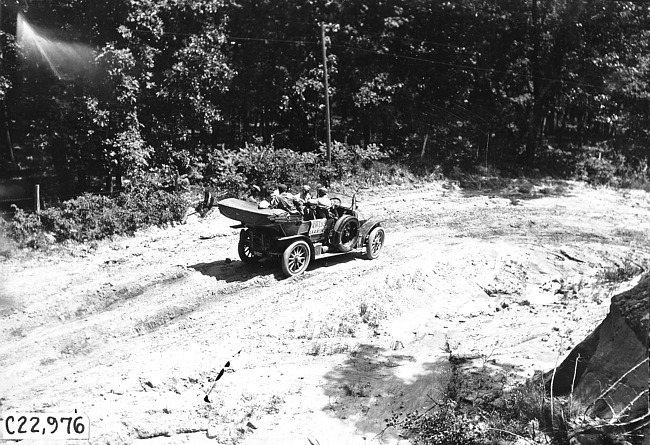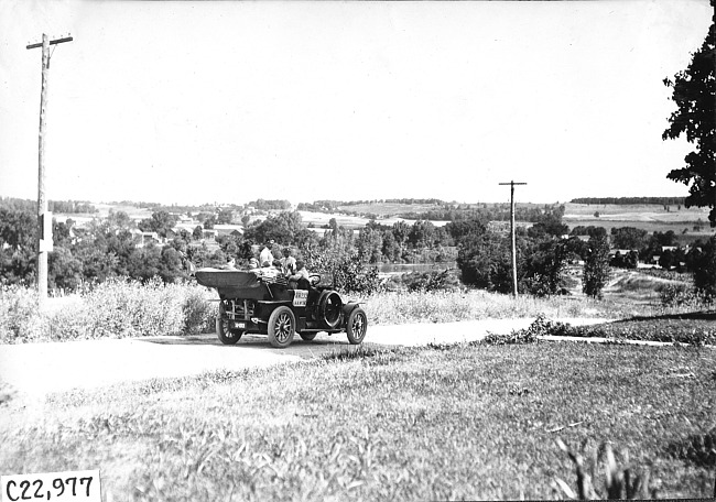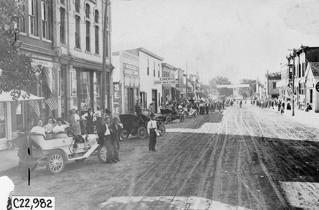William Bolger in Chalmers car entering Elroy, Wis., 1909 Glidden Tour