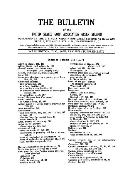 The bulletin of the United States Golf Association Green Section. Vol. 7, Index (1928 January)