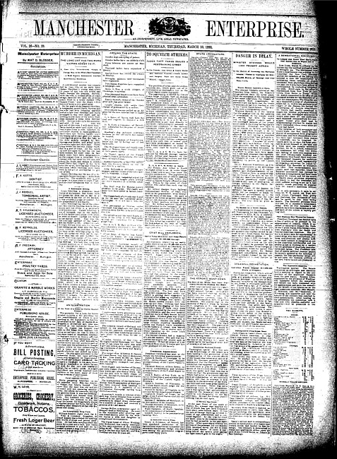 Text (1894)Part of Making of Modern MichiganManchester enterprise. Vol. 29 no. 2 (1895 September 19)