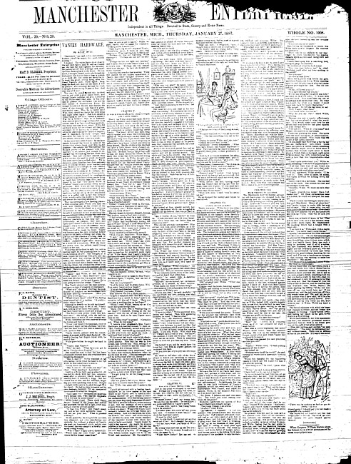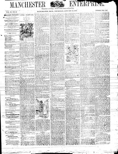 Text (1887)Part of Making of Modern MichiganManchester enterprise. Vol. 20 no. 20 (1887 January 27)