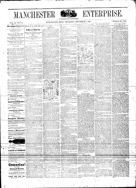 Text (1888)Part of Making of Modern MichiganManchester enterprise. Vol. 22 no. 13 (1888 December 6)