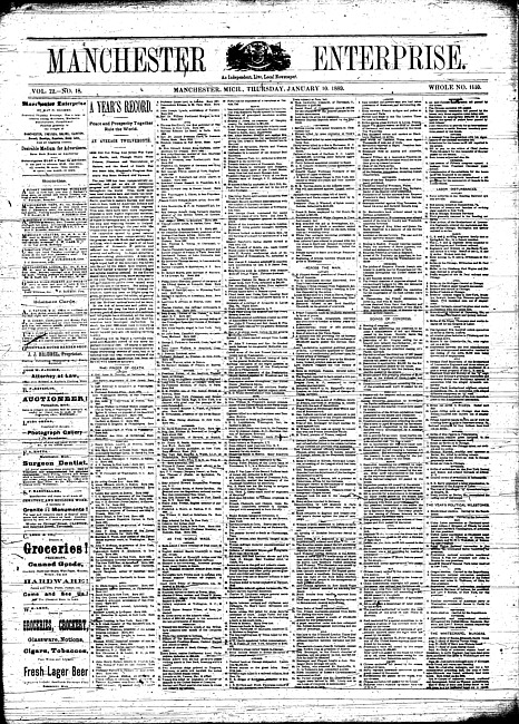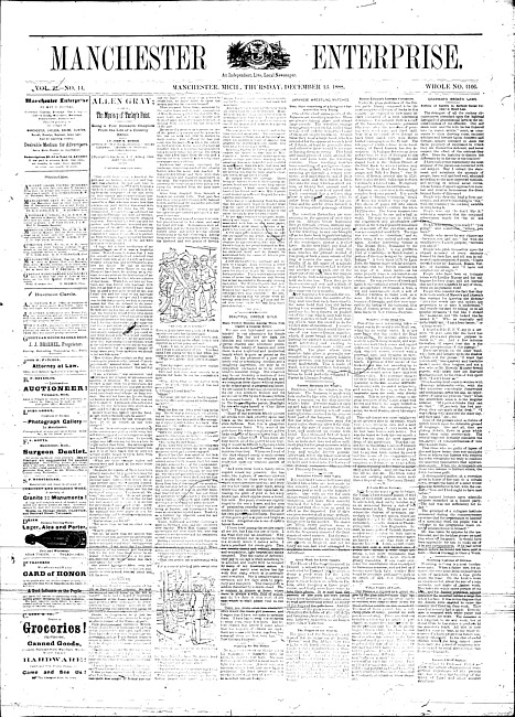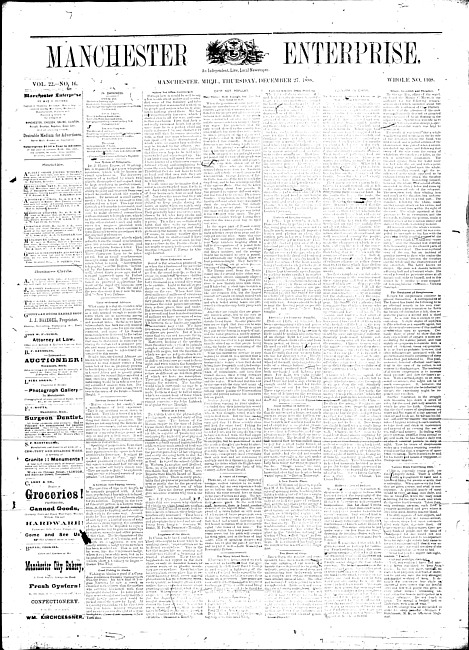 Text (1886)Part of Making of Modern MichiganManchester enterprise. Vol. 22 no. 16 (1888 December 27)