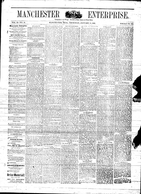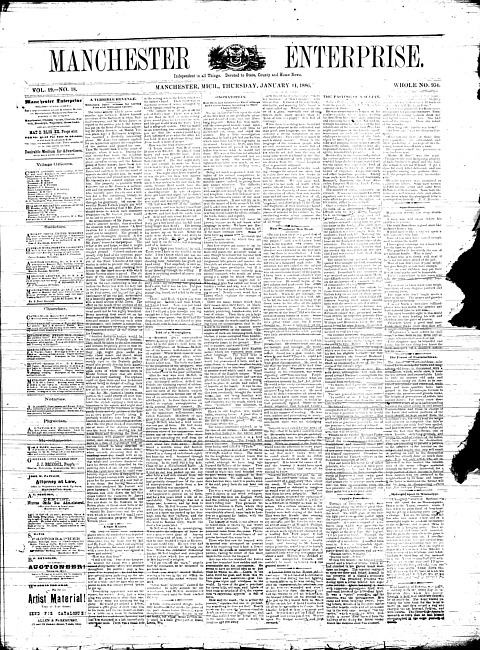 Text (1886)Part of Making of Modern MichiganManchester enterprise. Vol. 19 no. 19 (1886 January 21)