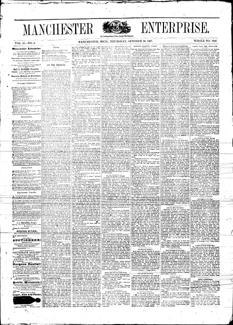 Text (1887)Part of Making of Modern MichiganManchester enterprise. Vol. 21 no. 6 (1887 October 20)