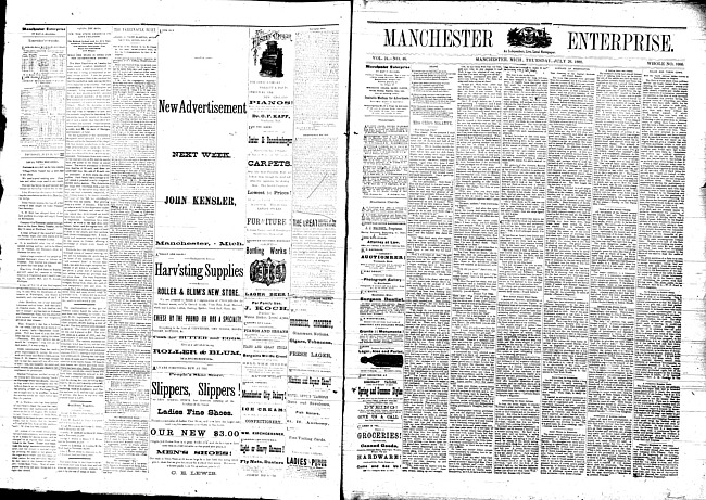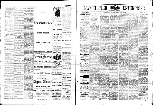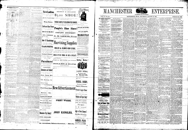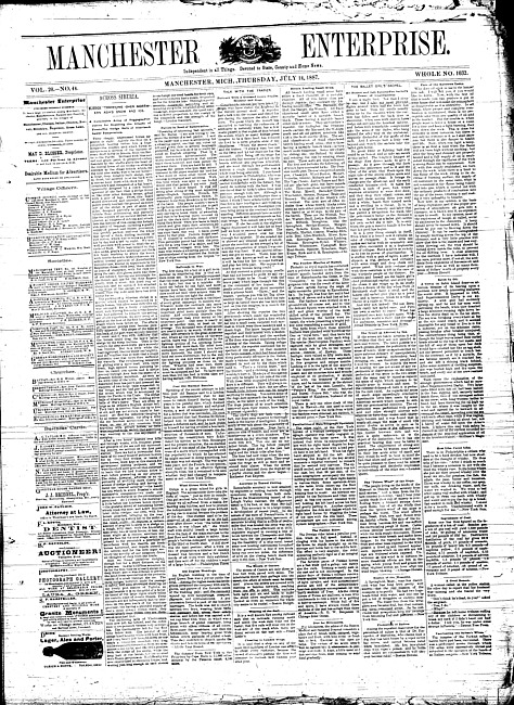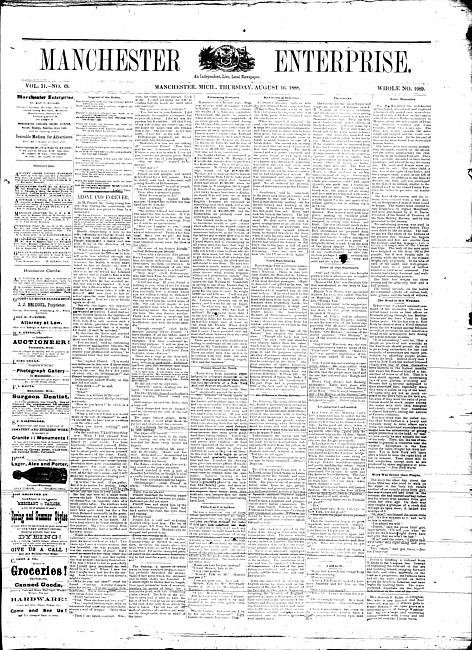 Text (1888)Part of Making of Modern MichiganManchester enterprise. Vol. 21 no. 49 (1888 August 16)