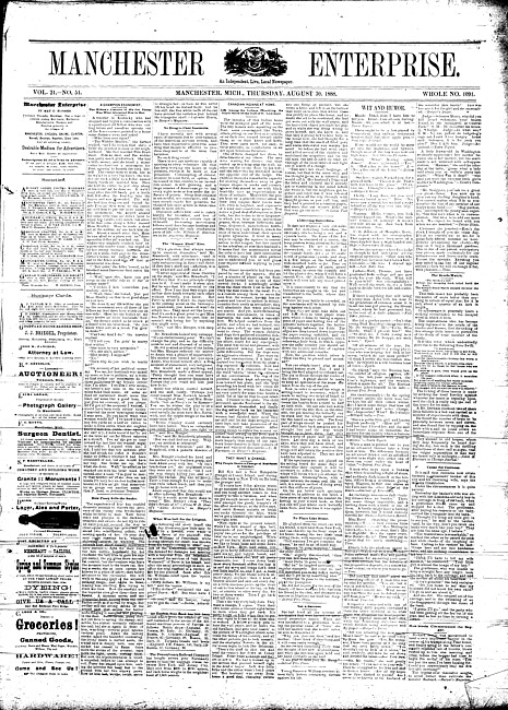Text (1888)Part of Making of Modern MichiganManchester enterprise. Vol. 21 no. 51 (1888 August 30)