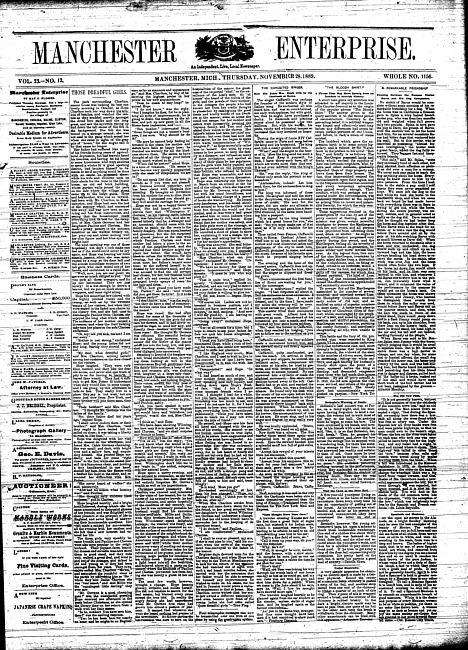 Text (1889)Part of Making of Modern MichiganManchester enterprise. Vol. 23 no. 12 (1889 November 28)
