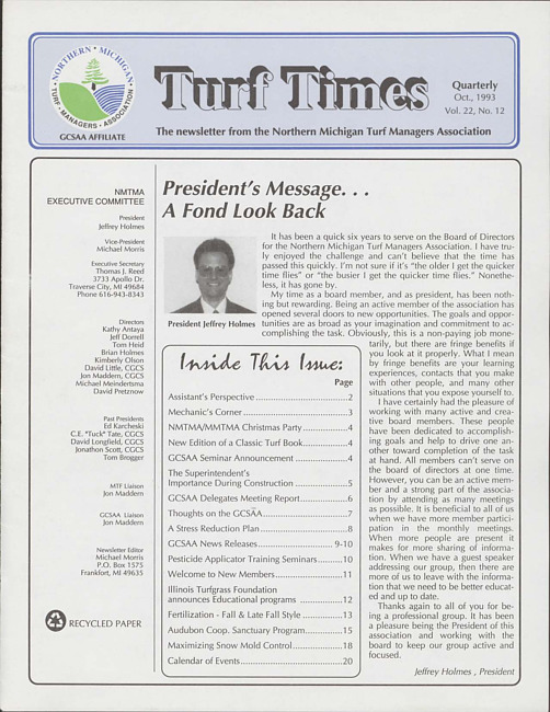 Northern Michigan Turf Managers Association newsletter. Vol. 16 no. 4 (1987 December)