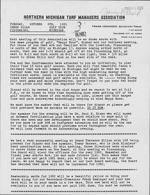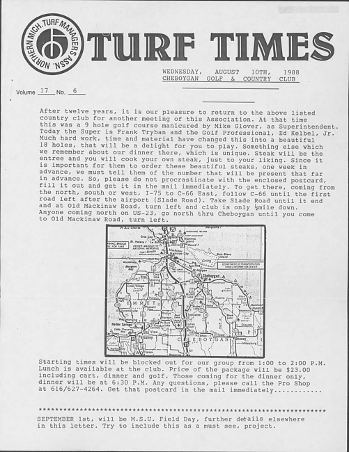 Text (1981)Part of Turf TimesNorthern Michigan Turf Managers Association newsletter. (1983 September)