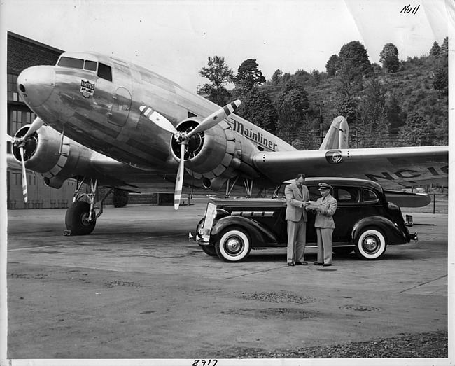 Still Image (1937)Part of Making of Modern Michigan1937 Packard touring sedan next to United Air Lines Mainliner airplane