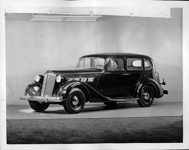 1937 Packard touring sedan, nine-tenths right front view, parked on street