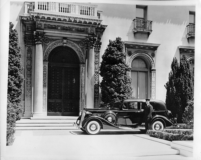 Still Image (1937)Part of Making of Modern Michigan1937 Packard formal sedan, parked in driveway in front of house with chauffeur
