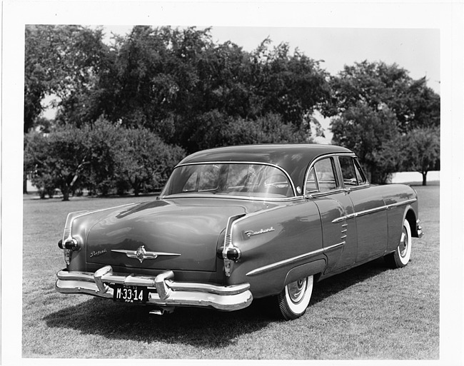 Still Image (1954)Part of Making of Modern Michigan1954 Packard sedan, three-quarter rear right view, parked on grass