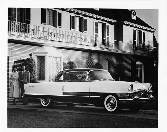 Still Image (1955)Part of Making of Modern Michigan1955 Packard 400 hardtop, parked in driveway of home, couple standing at rear of car