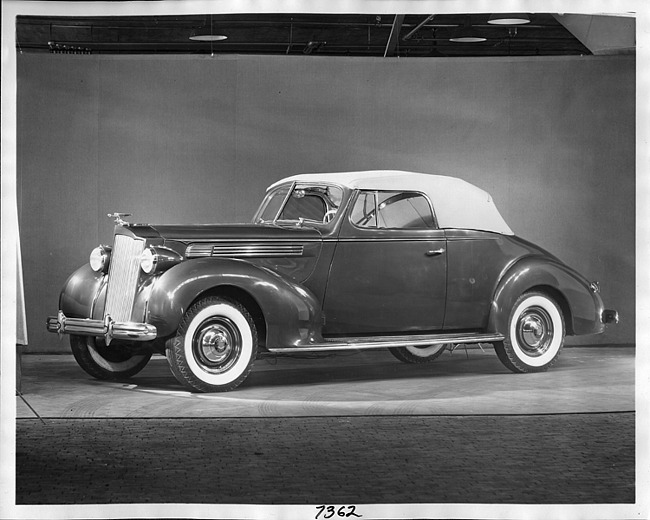 1938 Packard convertible coupe, nine-tenths left side view, top raised