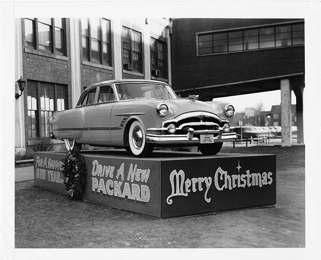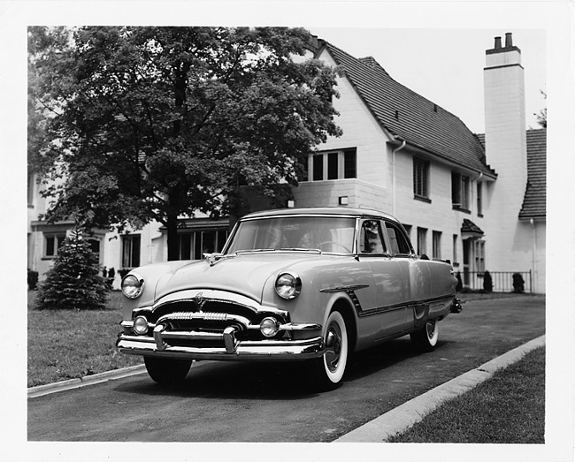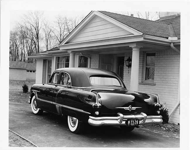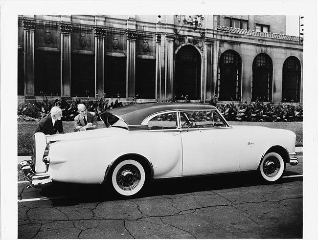 1953 Packard 2-door sedan, parked on street, two men looking at rear windshield