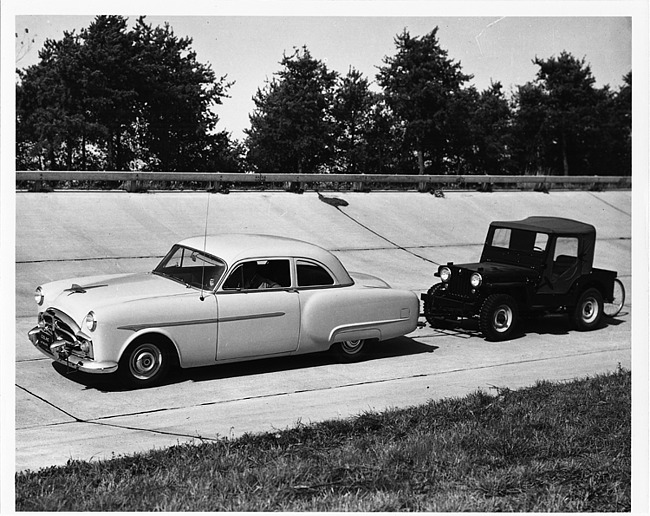 Still Image (1954)Part of Making of Modern Michigan1954 Packard club sedan pulling a jeep at Packard Proving Grounds