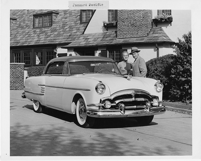 Still Image (1954)Part of Making of Modern Michigan1954 Packard Pacific, couple standing at driver's door, parked in driveway of house