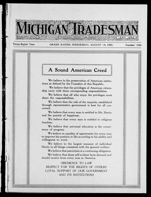 Michigan tradesman. Vol. 38 no. 1926 (1920 August 18)