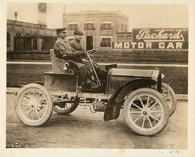 1904 Packard Model L with driver & passenger in front of Packard Motor Car Co.