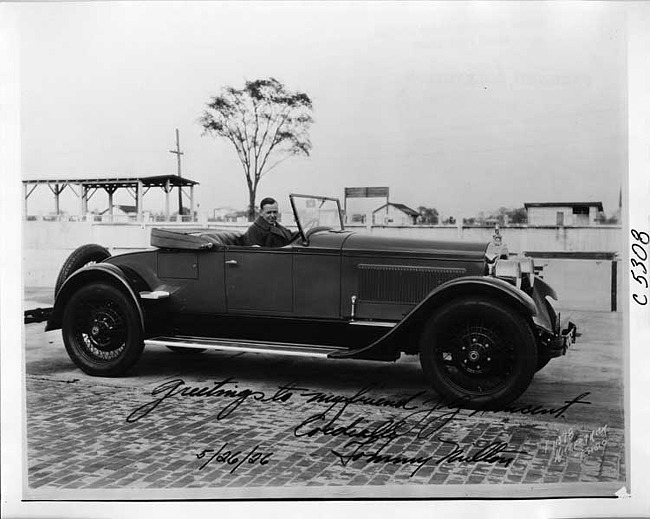 1925 Packard roadster, nine-tenths right front view, race car driver Tommy Milton at wheel
