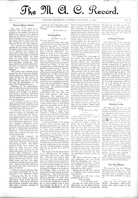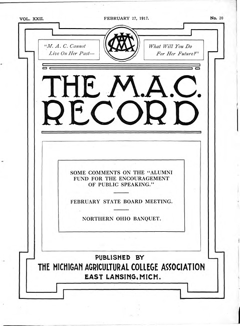 Text (1939)Part of M.A.C. Record (Serial 48)Michigan State College record. Vol. 43 no. 3 (1938 May)
